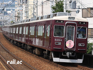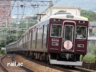 2016年の「祇園祭」ヘッドマークは2015年と同じもので,前祭と後祭の両方に合わせて7月1日から7月24日まで掲出されています。 7月1日から17日までは各線6編成ずつ「祇園祭」ヘッドマークを掲出,その内2編成ずつは18日頃から「天神祭」ヘッドマークに変更され,両祭のヘッドマークが共演します。 (写真は神戸線5006×8R)